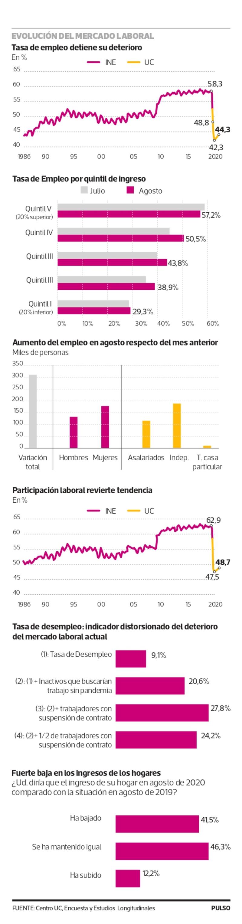 Otra señal que apunta a que lo peor está quedando atrás es que el mercado laboral también dejó de caer en agosto. Así lo reflejó la última encuesta de empleo del Centro de Estudios Longitudinales de la UC.