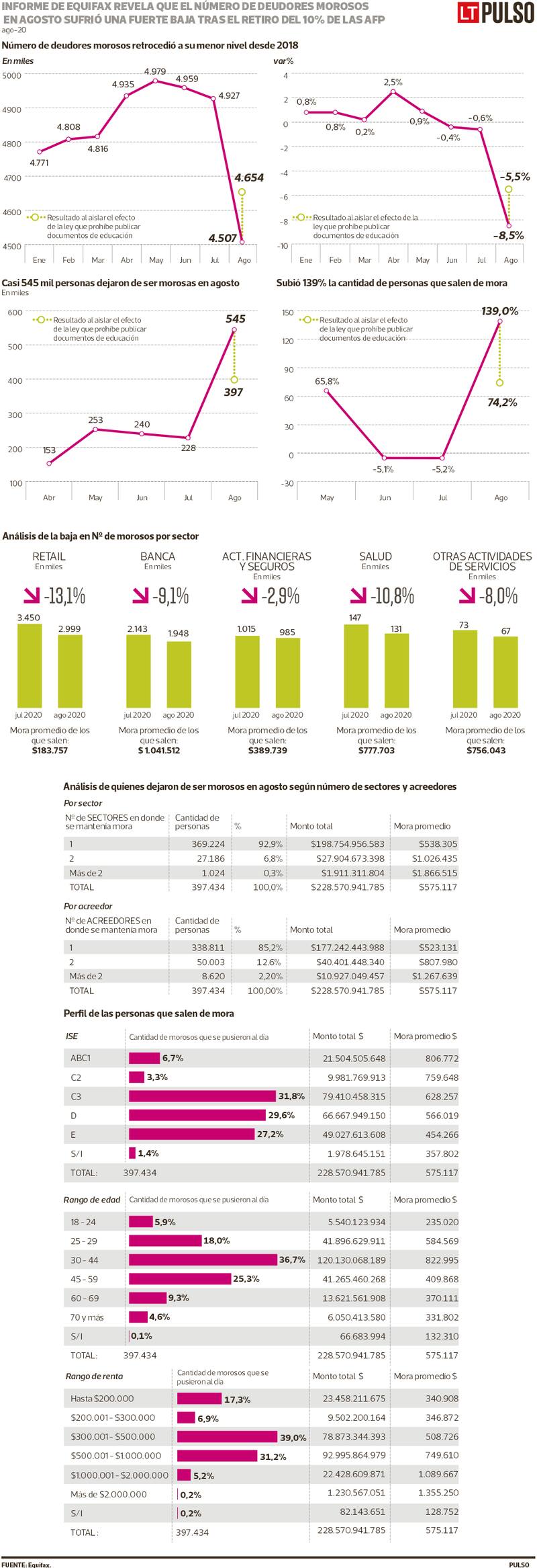 Las 544.556 personas que dejaron de ser morosas se distribuyen en dos grupos: 147.122 de ellos (27% del total), corresponde a quienes salieron de este registro debido a la llamada Ley “Chao Dicom”, que prohíbe publicar documentos asociados a instituciones de educación. En tanto, las restantes 397.434 (73%), son personas que dejaron de ser morosas en sectores distintos a la educación tras haber hecho un pago. Precisamente, es en este último grupo donde se refleja el efecto del retiro del 10% de los fondos de pensiones, ya que fue el 7 de agosto cuando las AFP iniciaron los pagos.