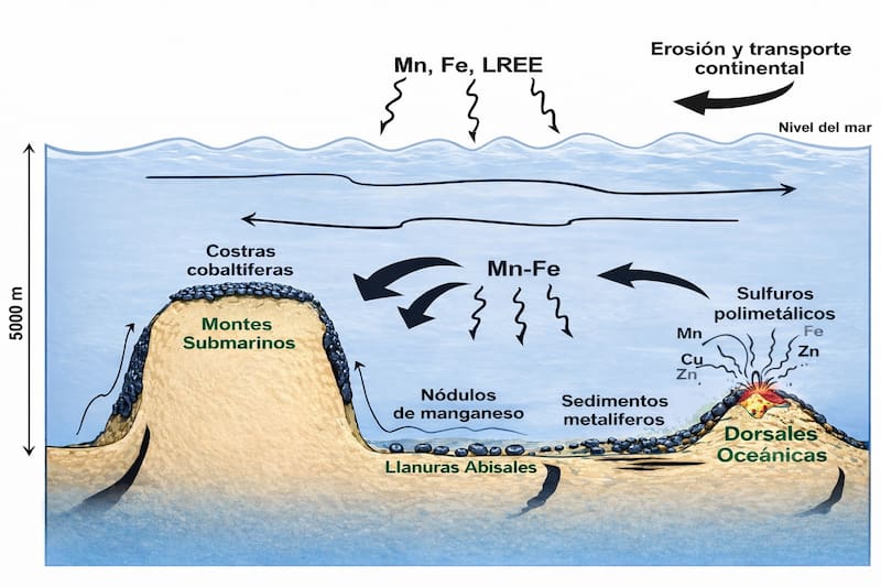 El área con mayor concentración de nódulos está en la zona de Clarion Clipperton (CCZ), por México y Hawái, donde se proyectan un total de 21 mil millones de toneladas secas. La estimación, dice el informe, es conservadora. Estos nódulos, ubicados entre 3.500 y 6.500 metros de profundidad, se componen principalmente de óxidos de hierro, manganeso, níquel y cobre, entre otros. Se compara el tamaño de estos nódulos con el de una papa, y para ser extraído no necesita de perforación o remoción de rocas o tierra, sino de recolección.