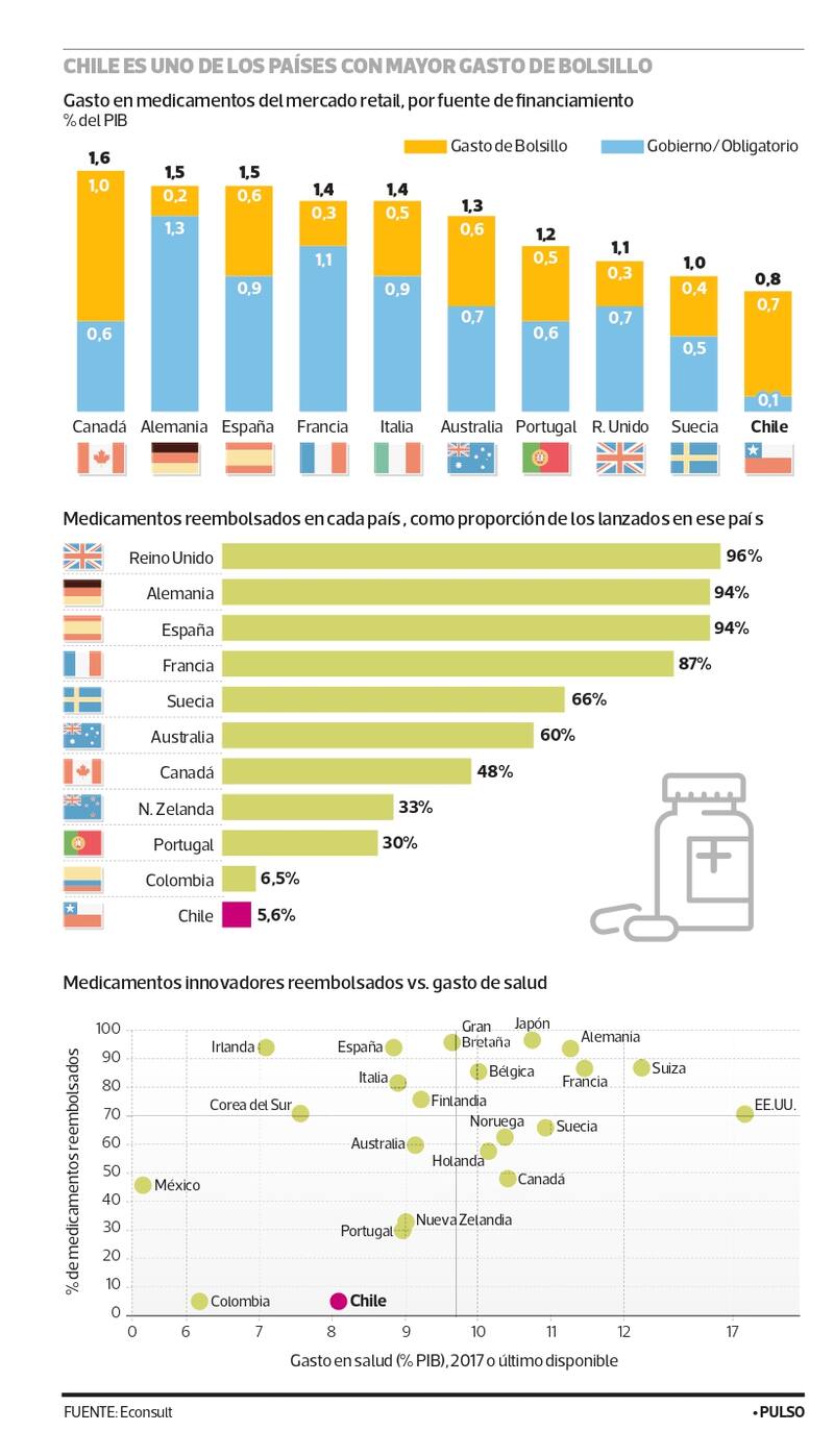 Chile figura entre los países de la OCDE con mayor gasto individual en medicamentos y menor gasto fiscal en salud. Se plantea un sistema estatal de copago de los remedios mediante un proceso transparente, centrado en los genéricos.