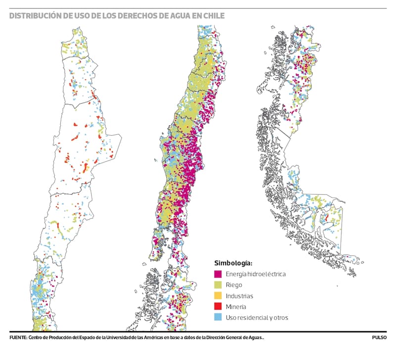De acuerdo con el Centro de Producción del Espacio de la UDLA, de los 29.001 titulares que poseen derecho de aguas consuntivos, el 1% concentraría el 79,02% del volumen total disponible en el sistema. Las regiones Metropolitana, de O’Higgins y del Maule acapararían el 45% del consumo nacional.