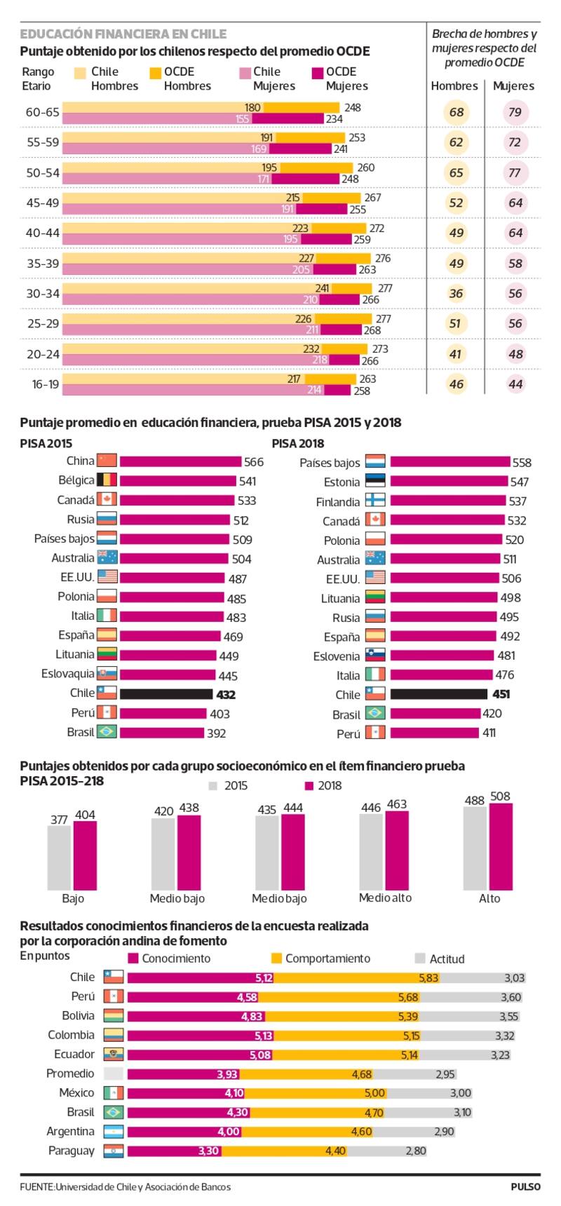 El estudio también aborda los resultados de la prueba Pisa. De acuerdo con la Ocde, solo se puede decir que se poseen las competencias mínimas requeridas en alfabetización financiera, si es que se alcanza al menos el nivel 2 (el 1 es el menor, y el 5 el máximo). En 2015, cerca del 38% de los estudiantes chilenos se encuentran bajo el nivel 2 y, por ende, no alcanzarían las competencias mínimas en materia de alfabetización financiera”, dato que está por sobre el promedio de 22% de los estudiantes que participaron en la prueba. Ese dato cae para 2018, llegando a 29,8%.