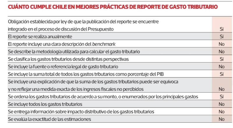 El texto dice, por ejemplo, que el benchmark utilizado para medir el gasto tributario “no es explícito ni consistente”. Además, agrega que numerosos gastos tributarios no están incluidos y, por lo tanto, no están calculados, y elimina otros tantos que están mal incluidos. Adicionalmente, no se identifica la fuente legal de cada uno de ellos. También manifiesta que se incluyen algunos gastos que no son “accionables”, es decir, que no entregan información sobre el impacto que pudieran tener en caso de que se modificaran. Por la falta de datos, en ciertos casos el cálculo del gasto real es deficiente.