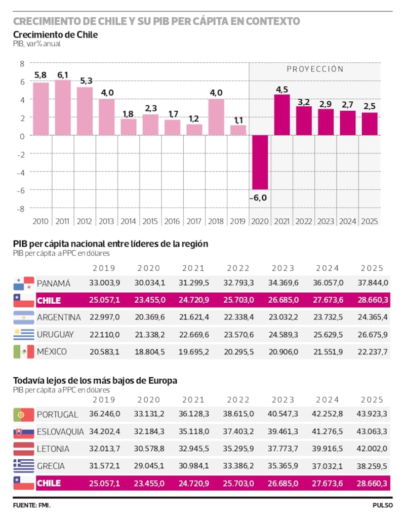Sin embargo, la base de datos actualizada del FMI reveló otro gran reto económico para el país; el del PIB per cápita. La posibilidad de que Chile fuera el primer país de América Latina que sobrepasara los US$30.000 en 2022, como el mismo organismo lo anticipaba años atrás, así como el sueño de alcanzar el nivel europeo, lucen cada vez más lejanos.