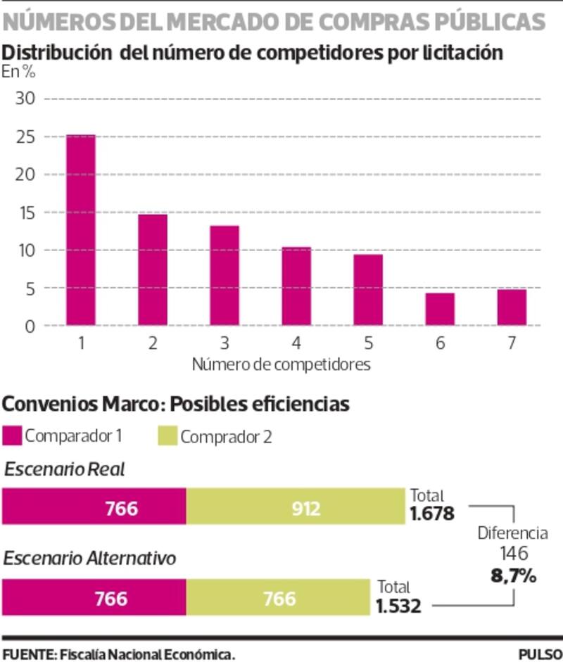 En el estudio, la FNE identificó que participan pocos proveedores en las licitaciones (lo que ocurre en el 55% de los casos) y que falta competencia en la entrada y funcionamiento de los convenios marco (25% del total).
