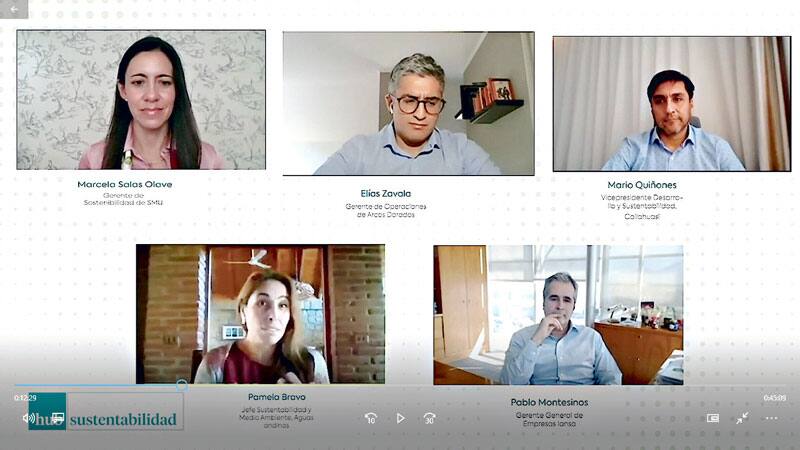 La conversación incluyó la participación de Pamela Bravo, jefa de Sustentabilidad y Medio Ambiente de Aguas Andinas; Marcela Salas, gerenta de Sostenibilidad de SMU; Pablo Montesinos, gerente general de Empresas Iansa; Elías Zavala, gerente de Operaciones de Arcos Dorados; y Mario Quiñones, vicepresidente de Desarrollo y Sustentabilidad de Collahuasi.