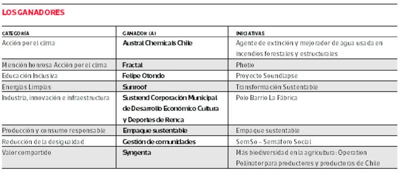 Los ganadores van desde el sector público, como es el caso de un proyecto apoyado por la Municipalidad de Renca, hasta iniciativas más relacionadas a la ciencia, como una que mejora el aguausada en incendios forestalesy estructurales (ver tabla deganadores).