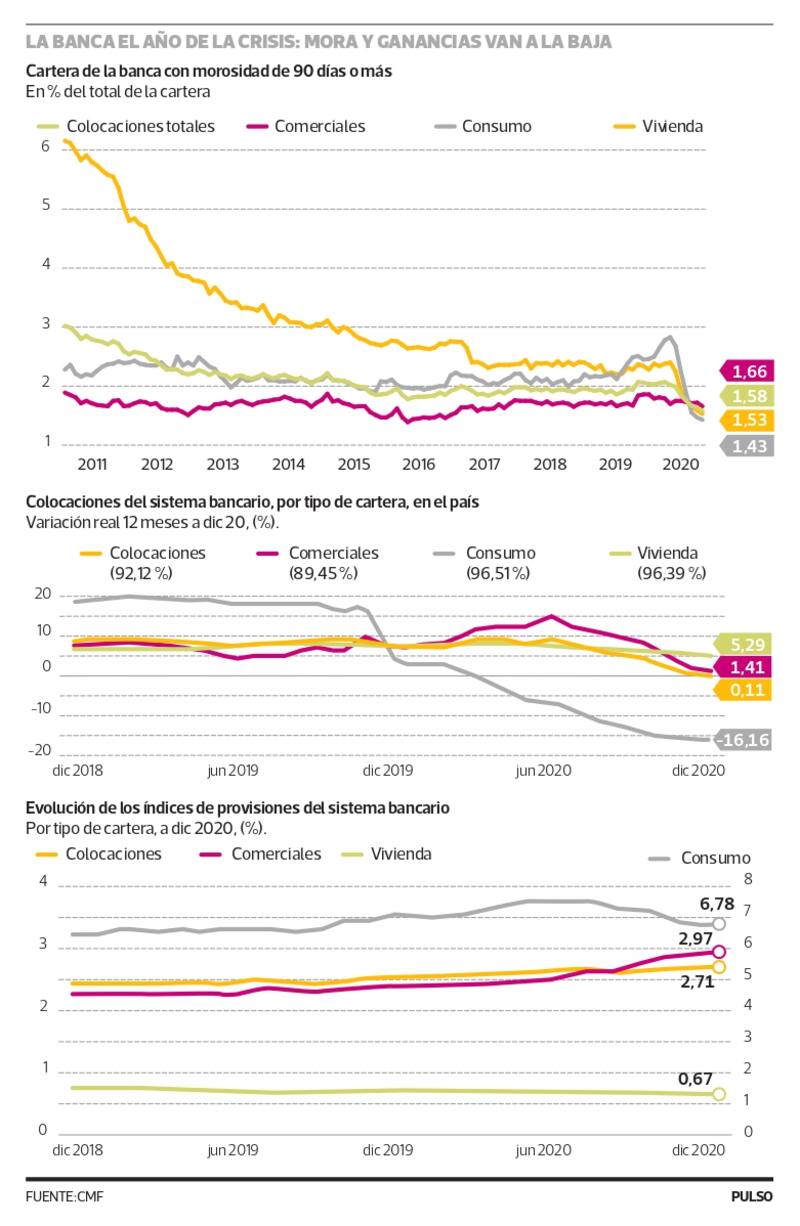 Al desagregar por tipo de cartera, en comercial la morosidad terminó 2020 en 1,66%, su menor nivel desde agosto de 2019. Por su parte, la mora mayor a 90 día en consumo finalizó el año pasado en 1,43%, su menor nivel desde que hay registro comparable. Asimismo, la mora en vivienda terminó en 1,53%, también su menor nivel al menos desde 2011.