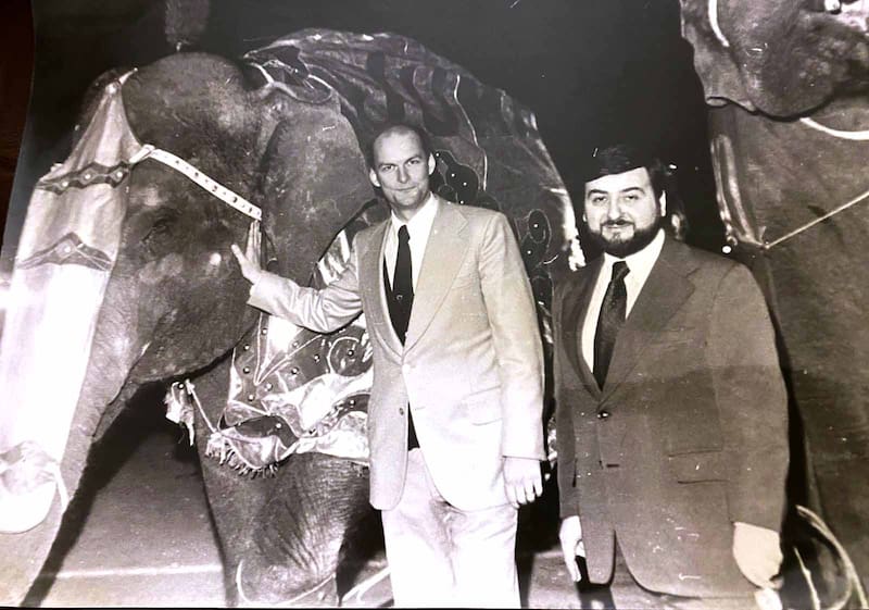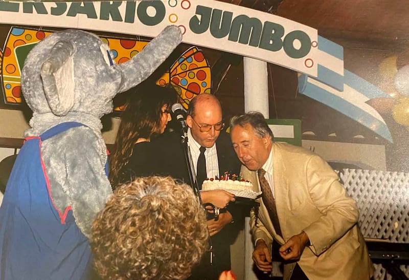 El mayor de los mamíferos terrestres fue el símbolo de Jumbo desde el comienzo. Anwandter conserva una fotografía de la inauguración de Jumbo Kennedy. En ella, aparece entre dos elefantes. Lo mismo hicieron tres años después, en su segundo local. Una empresa externa consiguió los elefantes con un circo de la época.