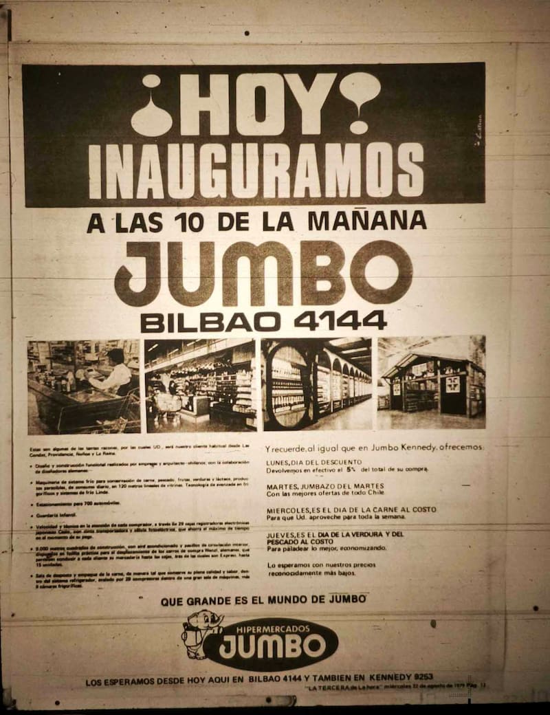 “¡Hoy! Inauguramos a las 10 de la mañana Jumbo Bilbao 4144″. El aviso publicado en La Tercera es del 22 de agosto de 1979, tres años después de la primera ficha de Jumbo, y prometía replicar las mismas ofertas que entonces tenía en Kennedy y fueron una marca de fábrica. Los lunes devolvían el 5% de la compra; los miércoles vendían la carne al costo; y los jueves inauguraban el día de la verdura y el pescado. “Para paladear lo mejor, economizando”, decía el aviso. Fue, dice el primer gerente general de Jumbo, una idea original de Paulmann. Como los festivos y fines de semana, el hipermercado se llenaba, necesitaban equilibrar el flujo, aumentando las compras de lunes a viernes. Pero no fue la única idea original: también pusieron una panadería dentro de los Jumbo, algo que los supermercados no hacían entonces. Los avisos de la época invitaban a sus clientes de Las Condes, La Reina, Ñuñoa y Providencia a avenida Bilbao.