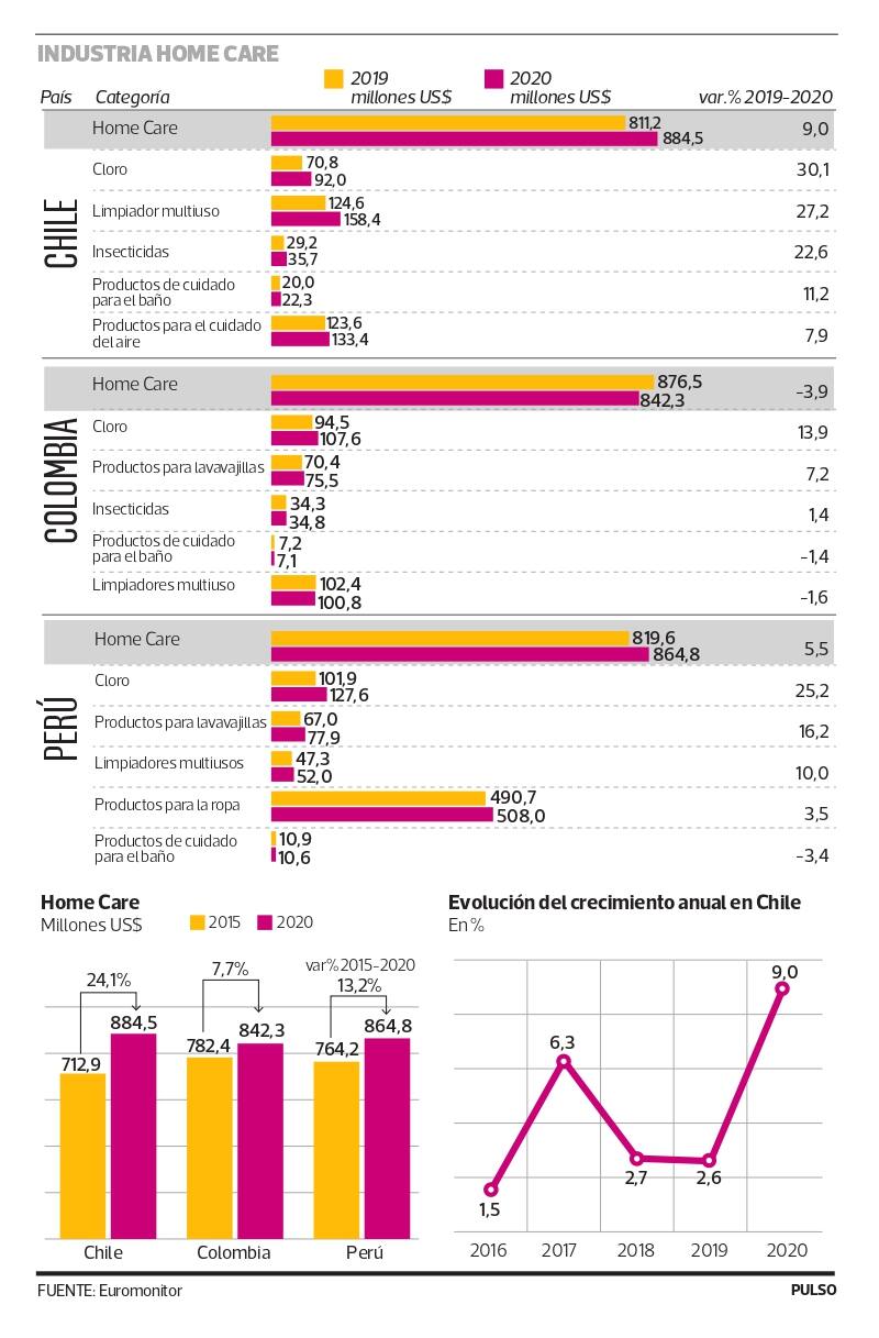 De acuerdo a estimaciones de Euromonitor, las ventas de la industria home care durante el año pasado totalizaron US$884,5 millones. Esto se traduce en un alza de 9% respecto a 2019.