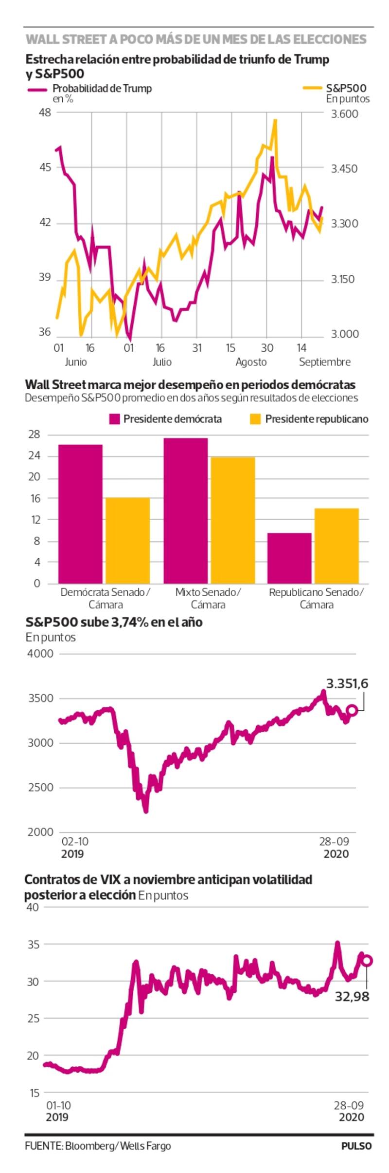 “La volatilidad implícita del período de elección es más alta que en marzo. El futuro del VIX de octubre, que hace referencia al período que incluye las elecciones del 3 de noviembre, y el futuro del VIX de noviembre, cuya alza se podría explicar por la preocupación de que los resultados de las elecciones tarden más de lo normal en procesarse, se han recuperado con fuerza. Esto en consonancia con los temores de los inversionistas sobre un período de alta volatilidad en torno a las elecciones estadounidenses. En niveles de 31 puntos y 33 puntos, respectivamente; ambos plazos se ubican en niveles más altos que los registrados en marzo y durante los períodos de alta volatilidad del primer semestre del año”, explicó Goldman Sachs en un reporte.