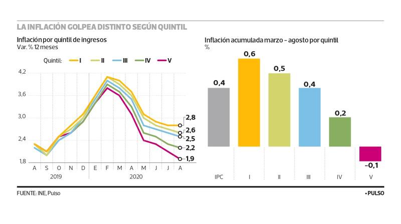 Según cálculos de Pulso, en base a los datos del INE, y considerando la matriz de gasto de la Encuesta de Presupuestos Familiares, en agosto el IPC en 12 meses del primer quintil -el 20% más pobre de la población- se mantuvo en 2,8% (misma cifra de julio), mientras que en el quinto quintil -el 20% más rico- bajó desde 2,1% a 1,9%.