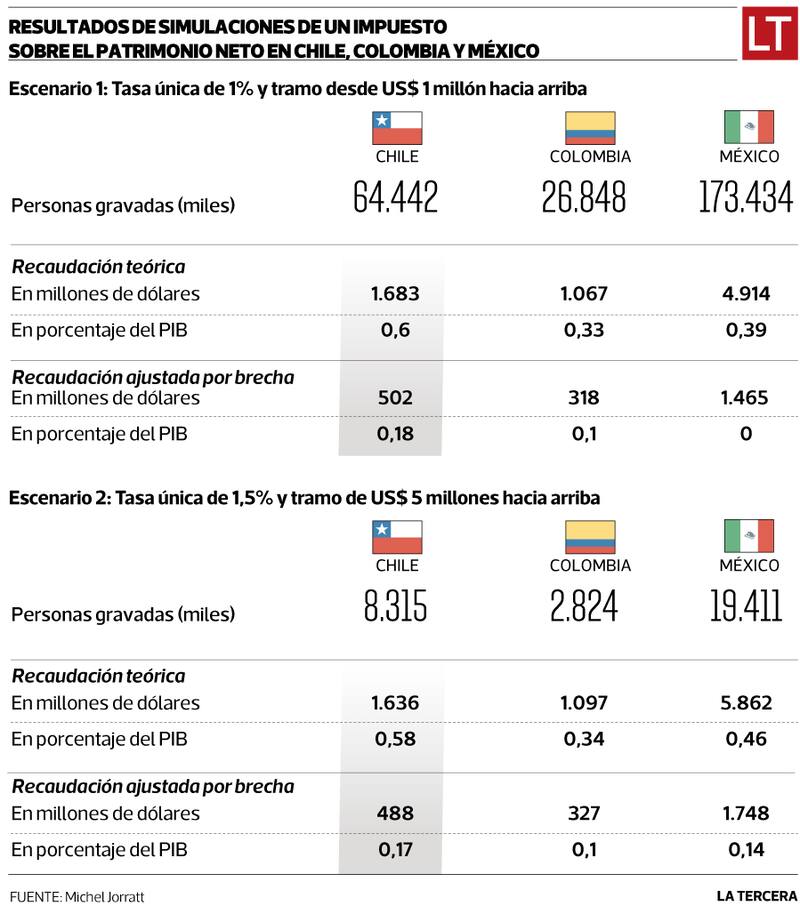 El estudio menciona que en Credit Suisse (2019) es posible encontrar datos con mayor nivel de detalle para tres países de la región: Chile, Colombia y México. Esta información fue usada para simular la aplicación de un impuesto sobre el patrimonio neto, evaluando sus impactos en términos de recaudación, teórica y ajustada por la brecha, y número de personas que resultarían gravadas.