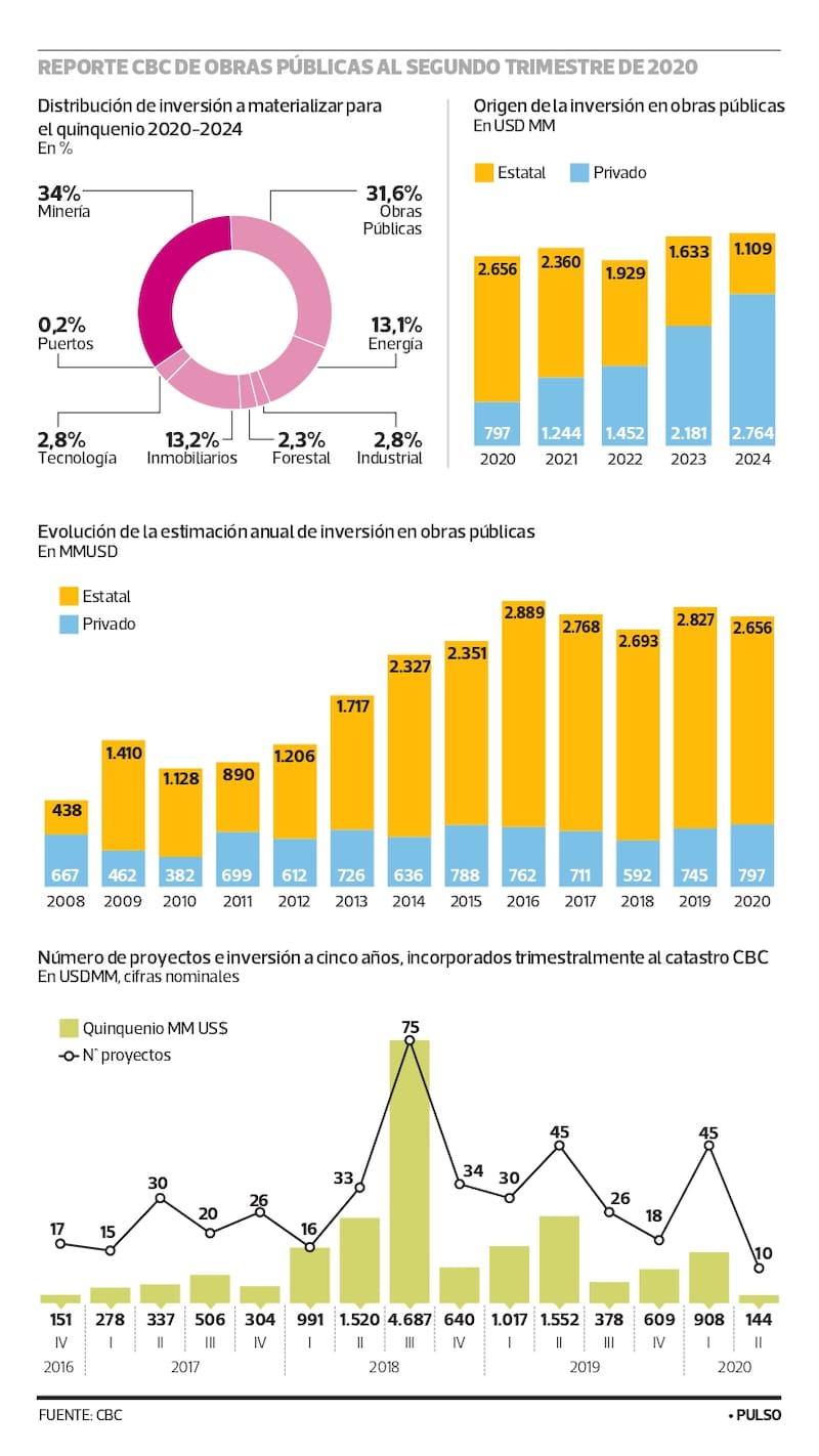 Una disminución de la inversión en obras públicas estimada a cinco años fue lo que detectó el último catastro sobre ese rubro de la economía, elaborado por la Corporación de Bienes de Capital (CBC) al cierre del segundo trimestre. La caída alcanza 5,5% en relación con igual período del año anterior, lo que se debe a los ajustes que se hicieron al calendario de licitaciones de concesiones y otros retrasos derivados de la pandemia.