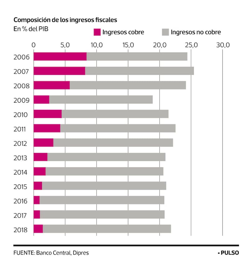 También ha bajado la importancia del cobre en los ingresos fiscales. Según datos de la Dipres, los ingresos directos al fisco por este tipo de minería, alcanzan cerca de 1,4% del PIB, mientras los ingresos totales del Fisco están en torno a 23% del PIB, es decir, ya no es el “sueldo de Chile”.
