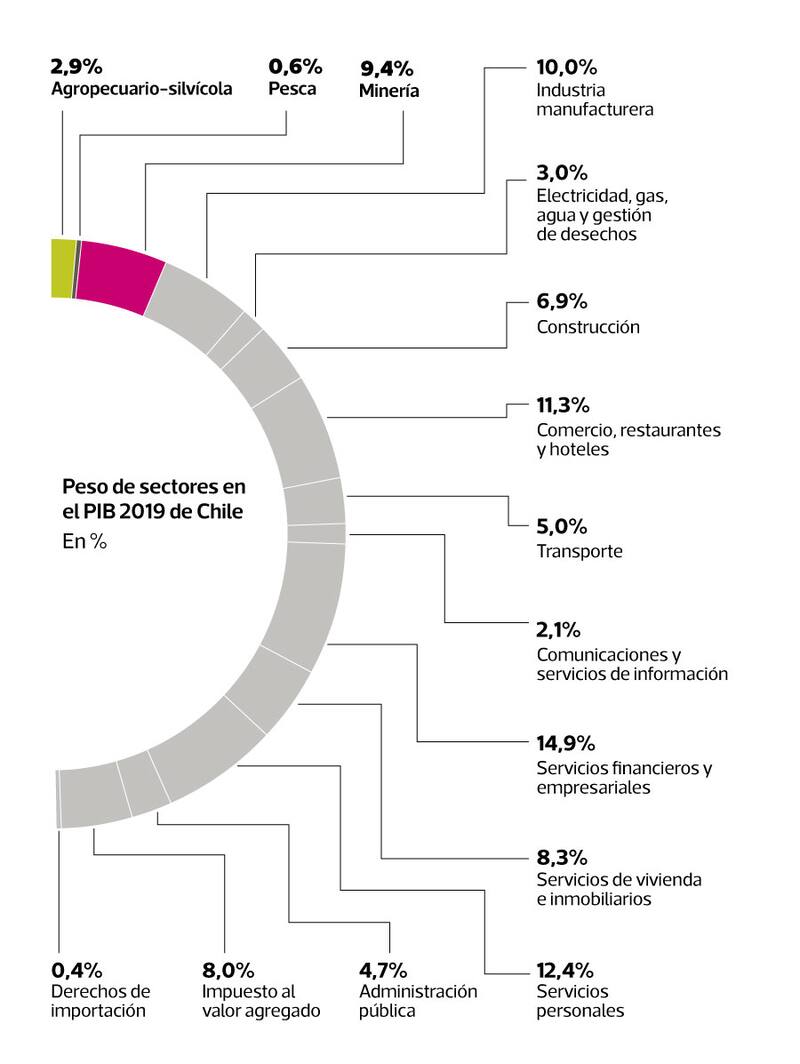 Asimismo, el valor del dólar sigue estando relacionado con el precio del metal rojo, por lo que las variaciones en el mineral terminan impactando indirectamente a otros sectores, debido al tipo de cambio. Con todo, lo que nos datos nos muestras es que Chile va avanzando una economía donde cada vez son más importantes los servicios.