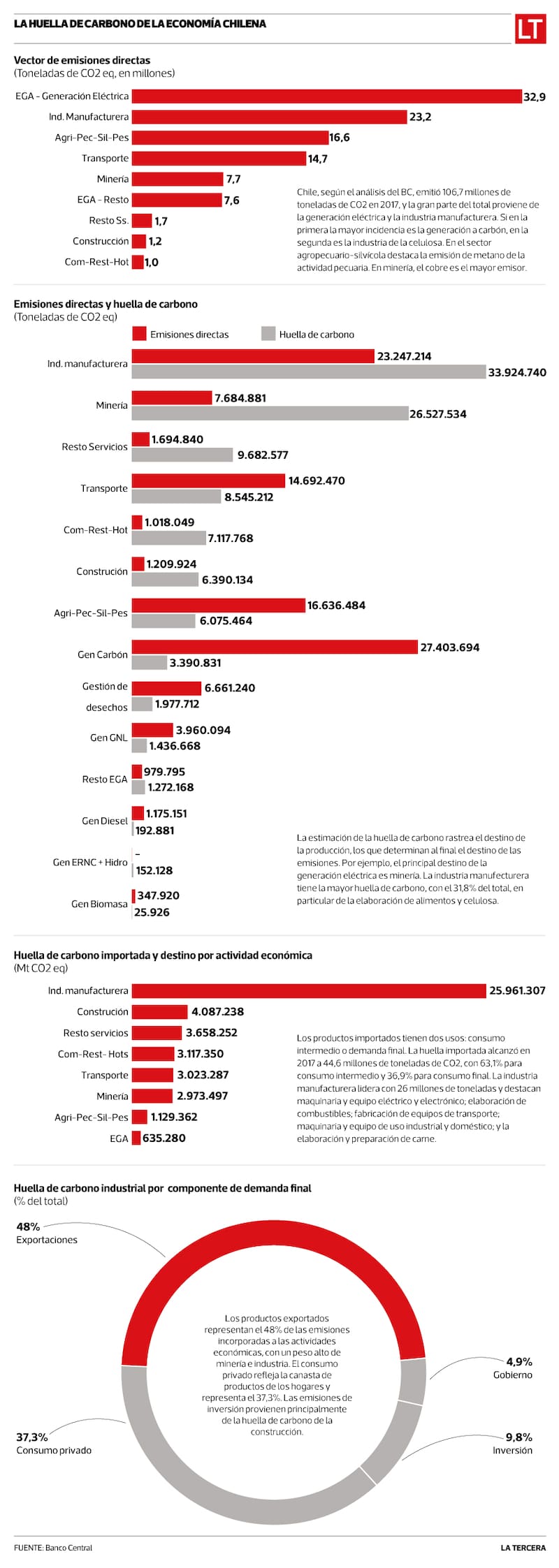 Chile, según el BC, emitió 106 millones de toneladas de CO2, y la generación eléctrica en base a carbón es la actividad con mayor nivel de emisiones directas, seguida por la industria manufacturera, la actividad agropecuaria-silvícola-pesca y el transporte. “Sin embargo, en términos de huella de carbono, las actividades con un mayor nivel de emisiones de CO2 incorporadas son la industria manufacturera y la minería, contabilizando un 56,7% del total emitido”, dice el reporte.