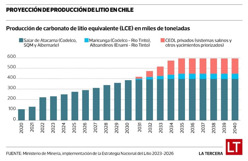 Al 2035, los Ceoles privados, dice un informe del Ministerio de Minería, harán que Chile alcance las 600 mil toneladas de carbonato de litio equivalente, experimentando un aumento desde el 2031. Las metas son consideradas por expertos como "altamente optimista" y "razonables".