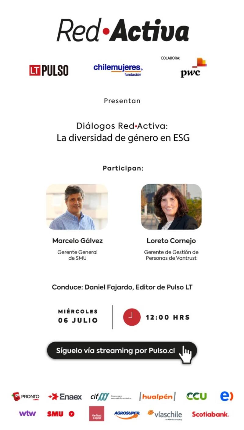 La diversidad de género bajo una mirada enfocada a los factores ambientales, sociales y de gobernanza (ESG por sus siglas en inglés) será el tema central del próximo encuentro de “Diálogos de Red Activa”, donde los panelistas, Loreto Cornejo, gerente de gestión de personas de Vantrust y Marcelo Gálvez, gerente general de SMU; abordarán la diversidad de género y su impacto en las áreas de sustentabilidad, social y de gobierno de las empresas.