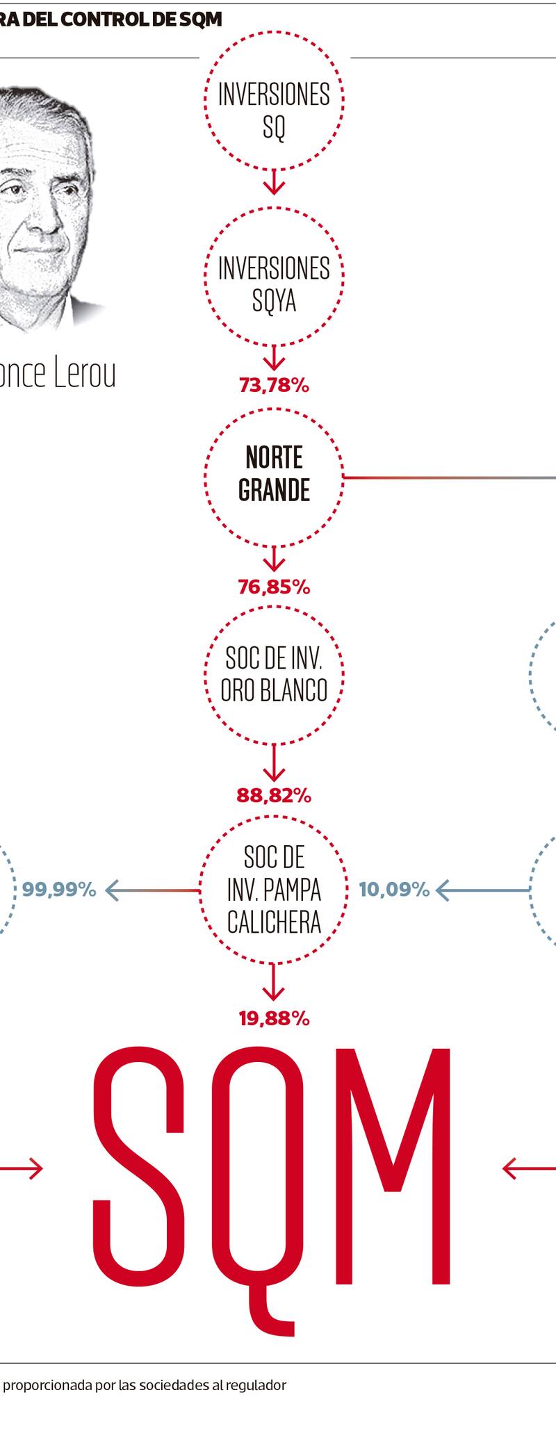 Julio Ponce se mantiene como accionista relevante de SQM, con el 31,1% de la propiedad, mediante una compleja estructura que le permite, vía Inversiones SQ y luego Inversiones SQYA, participar en cinco sociedades: Norte Grande, Oro Blanco, Nitratos, Pampa Calichera y Potasios (ver infografía).