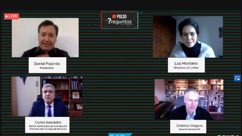 Luz Montero, directora de UC online; Carlos Saavedra, rector de la Universidad de Concepción y miembro del Consejo de Rectores; y Cristóbal Vergara, gerente general de SAP, fueron los panelistas invitados a un nuevo evento de “Las Preguntas que Vienen” de PULSO.