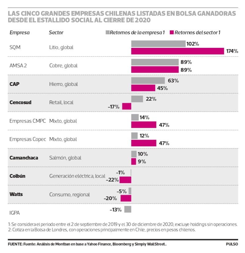 En Montblanc analizaron cuáles han sido las firmas locales abiertas en bolsa -excluyendo acciones que pertenecen a holdings financieros o sin operaciones reales- más fortalecidas en esta crisis, de manera de poder sacar ejemplos de ellas para poder adaptarse a los cambiantes nuevos tiempos. Analizaron la creación -o destrucción- de valor de las empresas del Índice General de Precios de las Acciones (IGPA) desde antes que se iniciara el estallido social, es decir, desde septiembre de 2019 hasta diciembre 2020, considerando precios de sus acciones, incluyendo dividendos y efectos de cambios de capital.