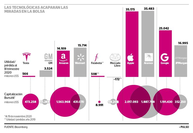 En los nueve primeros meses de 2020 Walmart ganó US$15.714 millones, y su valor en bolsa alcanzó los US$426.208 millones recientemente. Amazon, por su parte, logró utilidades de US$14.109 millones, pero en la bolsa está valorizada en US$1.563.766 millones. ¿Por qué la empresa que más gana no es la que tiene un mayor valor? Ese mismo ejercicio se puede hacer para Falabella y Mercado Libre, y la conclusión es la misma: la tasa de crecimiento de las compañías tecnológicas, y la perspectivas de que estas empresas terminarán ocupando el lugar de las tradicionales.