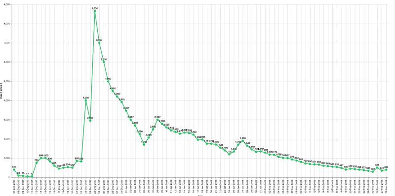 Poco menos de dos meses después de su peak, el 7 de febrero del 2018 ya había bajado de los mil pesos, y solo 20 días después bajó a los $349.