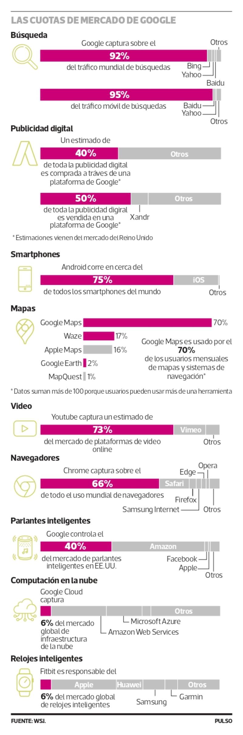 Google posee las herramientas más populares que se utilizan para colocar y comprar anuncios digitales. Al menos el 40% de los anuncios digitales en el Reino Unido se compran en una plataforma propiedad de Google, como Google DV360 o Google Ads, y al menos la mitad se vende en Google AdX, según un informe de la Autoridad de Competencia y Mercados del Reino Unido. En EE.UU., los fiscales generales estatales están investigando el control de la empresa sobre el mercado de la publicidad digital. Google se negó a comentar sobre una posible demanda de los estados, pero dijo en una publicación de blog reciente que sus productos “nivelan el campo de juego para las pequeñas empresas en todas partes”.