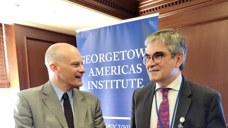 Posteriormente, el ministro realizó una clase magistral en Georgetown University frente a una audiencia de alrededor de 50 personas, entre ellas, estudiantes de pregrado, postgrado y parte de la comunidad académica chilena residente en Estados Unidos. Allí abordó la agenda de reformas del gobierno del Presidente Gabriel Boric y en el compromiso de avanzar en la consolidación fiscal en los próximos años.