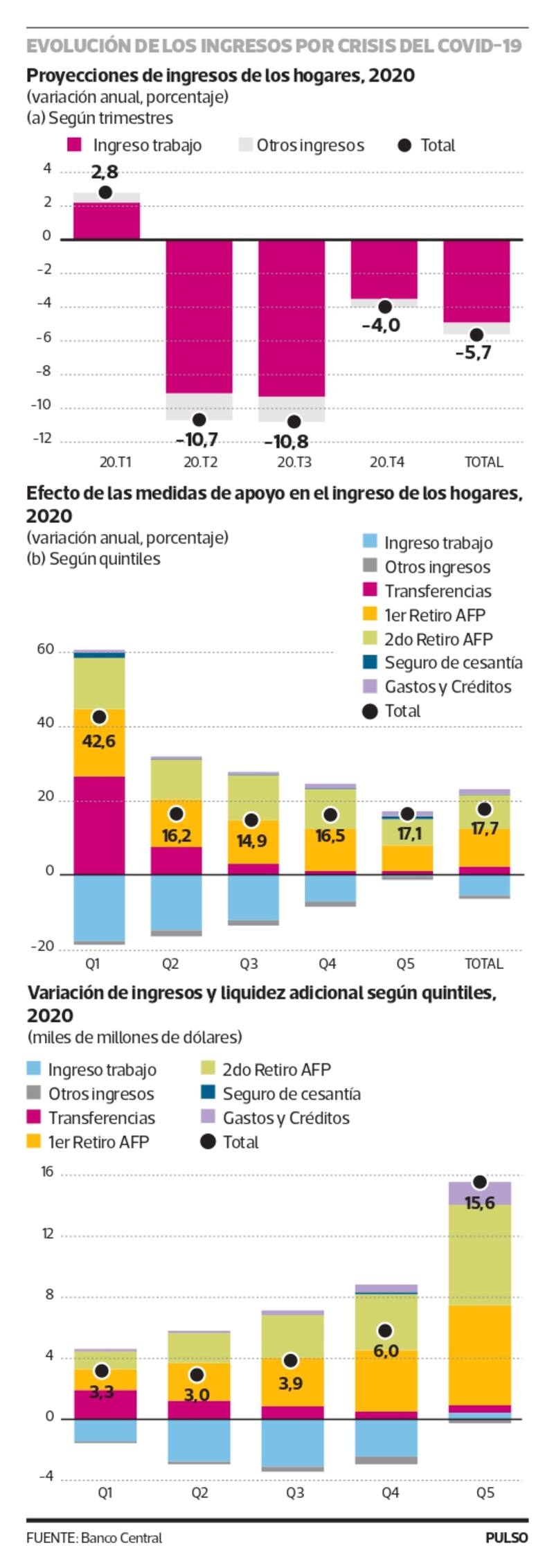 Asimismo, el informe incorpora el efecto de los retiros previsionales detectando que benefició mayormente a los de mayor ingreso. “Proporcionalmente fue más importante para los quintiles 2,3,4 y 5, y de hecho el quinto quintil captura la mayor parte de la liquidez producto de este retiro muy por encima de los otros. Ello significa que mientras en el primer quintil las transferencias ayudaron a compensar la caída de ingresos, en los otros ha tenido una importancia mayor el retiro; y en el quinto quintil de mayores ingresos el retiro no compensó caída de ingresos porque no se produjo”, recalcó Marcel.