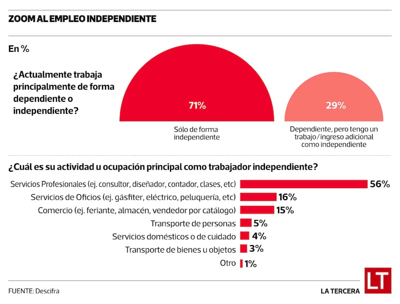 Y para caracterizar a este grupo de trabajadores, Descifra -alianza entre Copesa y la empresa de investigación de mercado y comunicaciones estratégicas Artool- realizó un Estudio sobre el Trabajo Independiente. Entre los principales resultados en este grupo, se muestra que 7 de cada 10 encuestados trabaja solo de manera independiente y un 29% combina este rol con un empleo dependiente como complemento importante de ingresos.