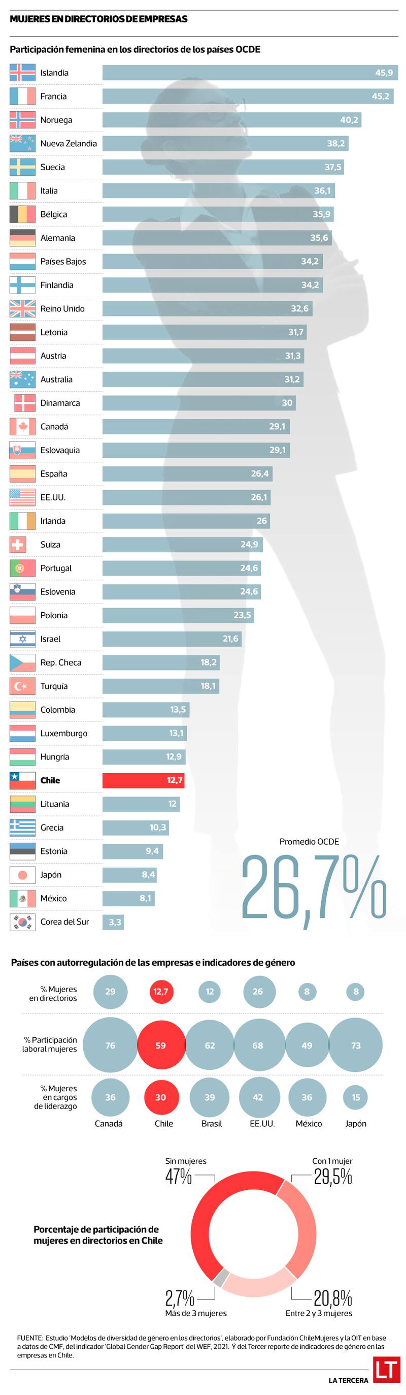 El promedio de los países de la Ocde está en el 26,7% de representación femenina en los directores, cifra que aunque no llega al 30%, sobrepasa el promedio mundial del 18,2% y es bastante más alta de lo que se ve en Latinoamérica (12,5%).