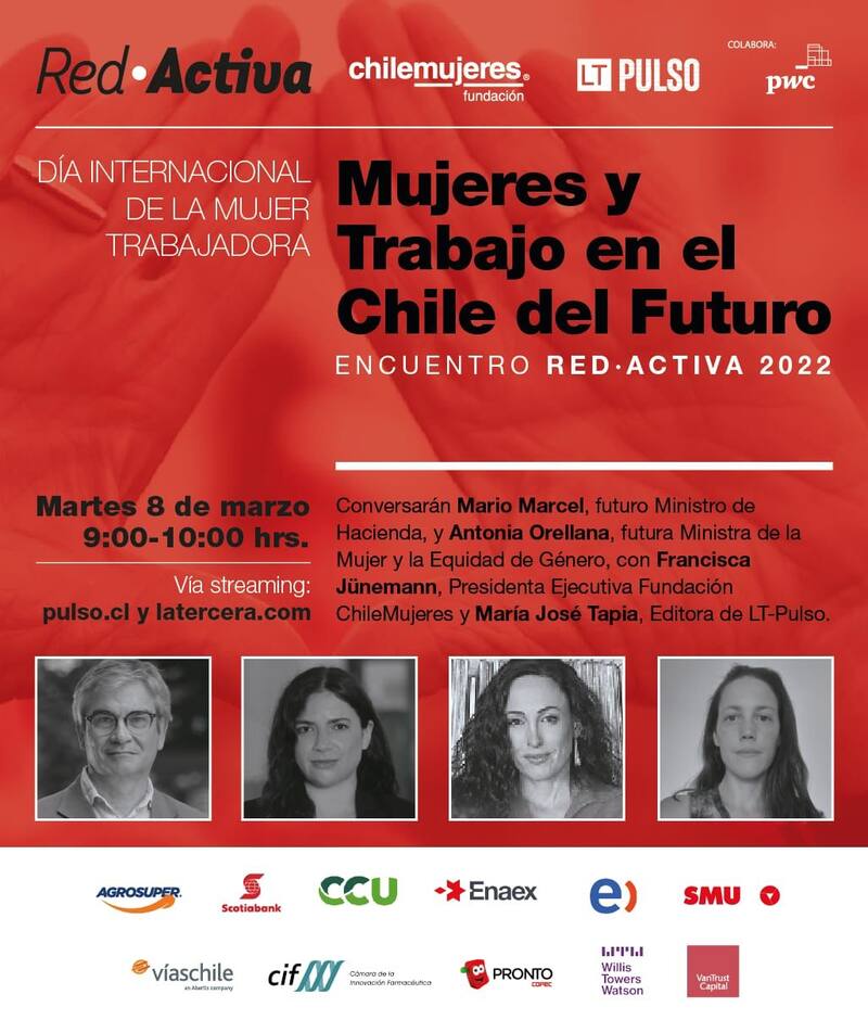 En el marco de la conmemoración del Día Internacional de la Mujer Trabajadora, Red Activa, La Tercera - Pulso y la Fundación ChileMujeres, en colaboración con PwC-Chile, conversarán con Antonia Orellana, futura ministra de la Mujer y la Equidad de Género, y Mario Marcel, próximo ministro de Hacienda, para abordar los principales desafíos y prioridades de su gobierno en materia de empleo femenino.