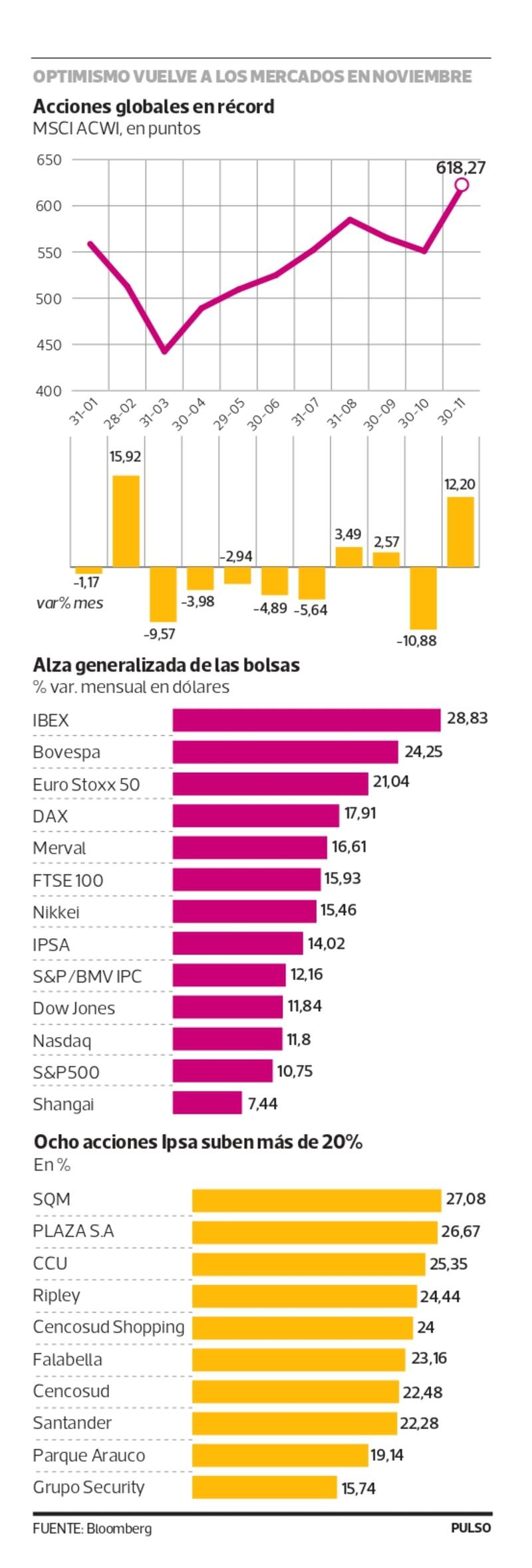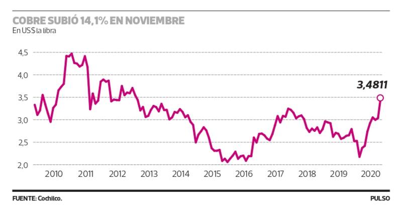 El penúltimo mes del año se podría calificar de euforia para los mercados. Un cobre subiendo 14,6% en noviembre y bolsas como la de España haciéndolo 28,8%, marcaron un periodo caracterizado por el mayor optimismo de los inversionistas ante los avances de las vacunas contra el coronavirus. El arribo de Biden a la presidencia de Estados Unidos, en tanto, es leído como un escenario de mayor debilidad para el dólar.