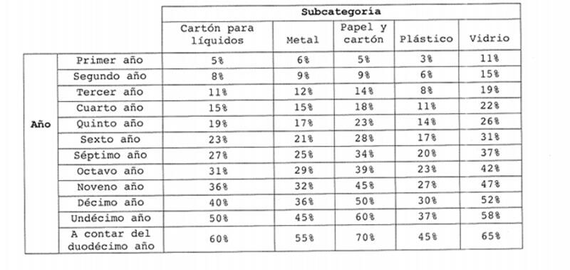 Por ejemplo, dentro de los envases y embalajes “domiciliarios”, la subcategoría de plástico, tendrá la obligación de revalorizar un 3% de sus productos, hasta llegar al 45% a partir del duodécimo año. Con respecto al papel y cartón, comienza con 5%, llegando hasta el 70% en el mismo periodo (ver imagen)