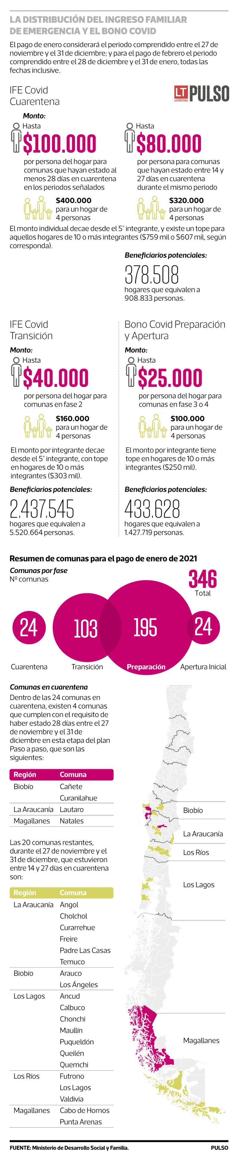 Así, mediante un decreto exento se generarán 2 pagos correspondientes a enero y febrero de 2021. Uno será el IFE Covid para comunas en cuarentena (fase 1) y transición (fase 2). Además, se entregará un Bono Covid para comunas en Preparación (fase 3) y Apertura Inicial (fase 4).