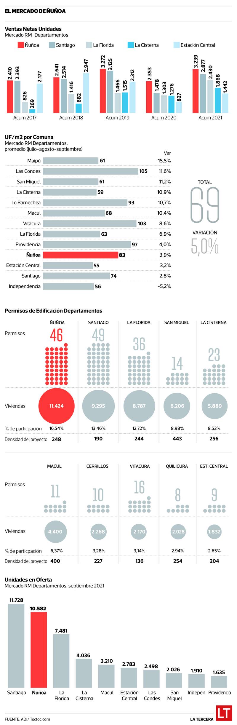 La demanda por departamentos en esa comuna sigue siendo robusta. Entre enero y septiembre, la industria ha vendido 3.239 unidades, 38% más que el año pasado. Otras nueve comunas crecieron más, pero en Ñuñoa hubo más compradores que en Santiago (con 2.877 departamentos vendidos) y La Florida (2.430), que son las que le siguen (ver infografía). Ese mismo primer lugar se repite para igual período al menos desde 2017, según TocToc.com. En valor, en Ñuñoa se han vendido más de 14 millones de UF en 2021; en toda la RM son 111 millones de UF.