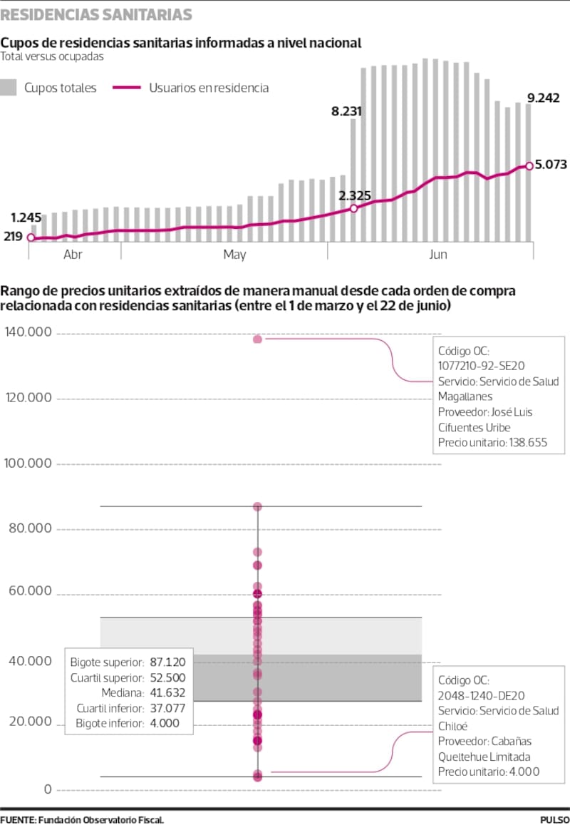Así, desde que comenzó la pandemia -principios de marzo- al 22 de junio, existen 421 órdenes de compras clasificadas como compras de noches de habitaciones en hoteles. En este aspecto, la entidad, que analizó la situación, señaló que se tuvo que revisar las descripciones de cada una con la finalidad de saber cuáles correspondían a compras de servicios hoteleros destinados a residencias. “Esta revisión manual no sería necesaria si el Estado estuviera generando una marca en las órdenes de compra relacionadas con la crisis sanitaria, como lo recomendó la Comisión de Gasto Público”, se aseguró, agregando que “como resultado de lo anterior, se encontraron 87 órdenes de compra relacionadas a residencias sanitarias. Estas adquisiciones fueron realizadas por 22 instituciones públicas, y los proveedores involucrados alcanzan la cifra de 47 hoteles distintos. Esta última cifra difiere considerablemente de las 138 residencias sanitarias mencionadas en las cifras oficiales”, se acusó en el informe de Observatorio del Gasto Fiscal. Por lo que, “se requiere de mayor transparencia en los procesos de adquisición de servicios de residencias sanitarias”.