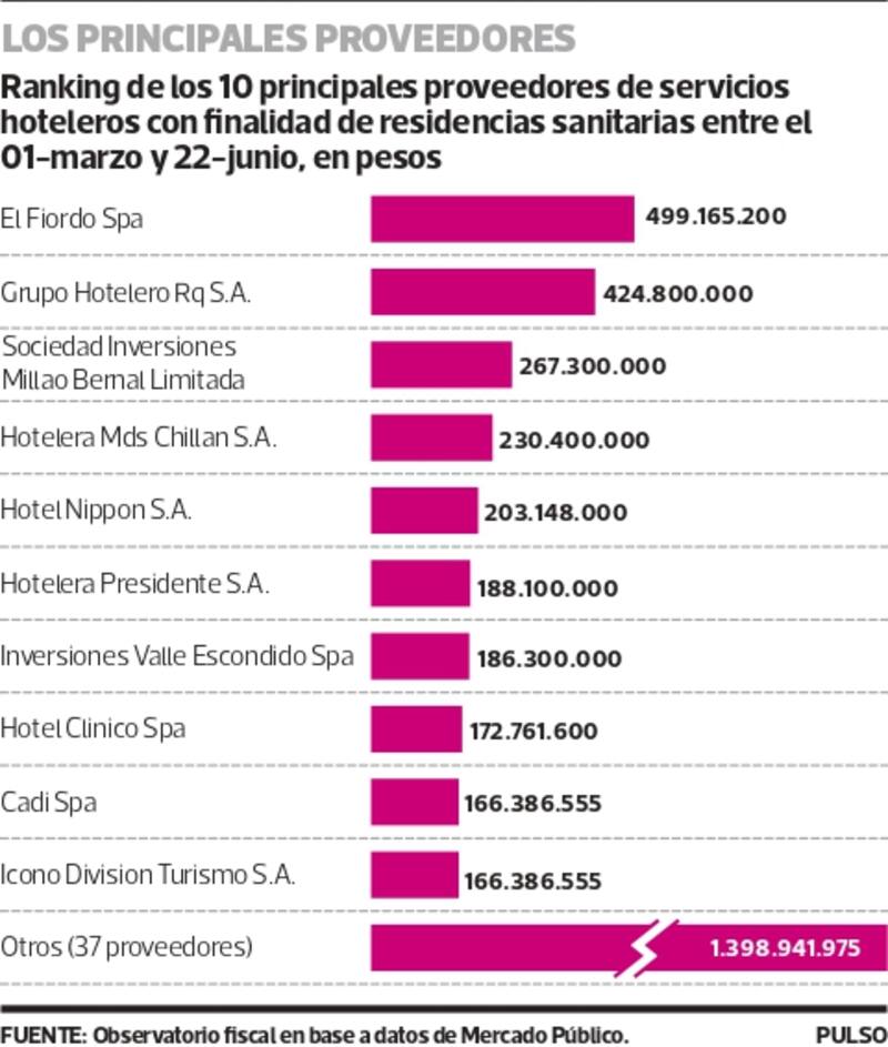 Además, la entidad señaló que hay proveedores que se han llevado un porcentaje importante de los recursos contratados a la fecha que podrían convertirse en un riesgo. Ejemplo de ello son los proveedores El Fiordo y Grupo Hotelero Rq , con un 12,8% y 10,9% de los montos contratados, respectivamente, señala la entidad.
