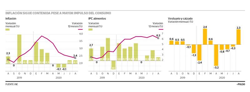 El índice mensual se ubicó en 0,1%, mientras que en el año acumula un avance de 1,4% y 2,4% en 12 meses. Alimentos moderaron alza y economistas esperan un IPC de entre 0,2% y 0,3% para septiembre.