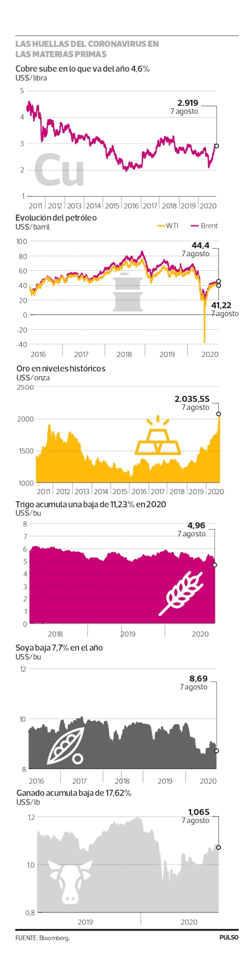De los peores augurios a las más grandes expectativas se ha transitado este año, cuando se trata del mercado de los commodities. Derrumbes que en marzo dejaron al precio del petróleo en terreno negativo y al cobre con un descenso de 25% en lo que iba transcurrido del año ya son parte del pasado. En el primer caso, el repunte es de más de 100%, tanto para el Brent como para el WTI, mientras que nuestro principal producto de exportación ha subido 39,4% desde entonces.