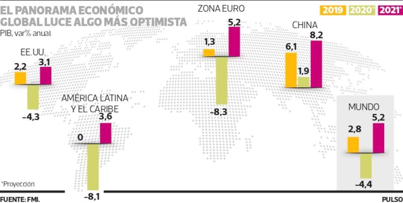 Menos penumbras se ven en el horizonte de un año, que pasará a la historia por el coronavirus, de acuerdo con la nueva entrega de las perspectivas económicas del FMI. El organismo mejora sus proyecciones para 2020 de una contracción de 5,2% a una de 4,4%.