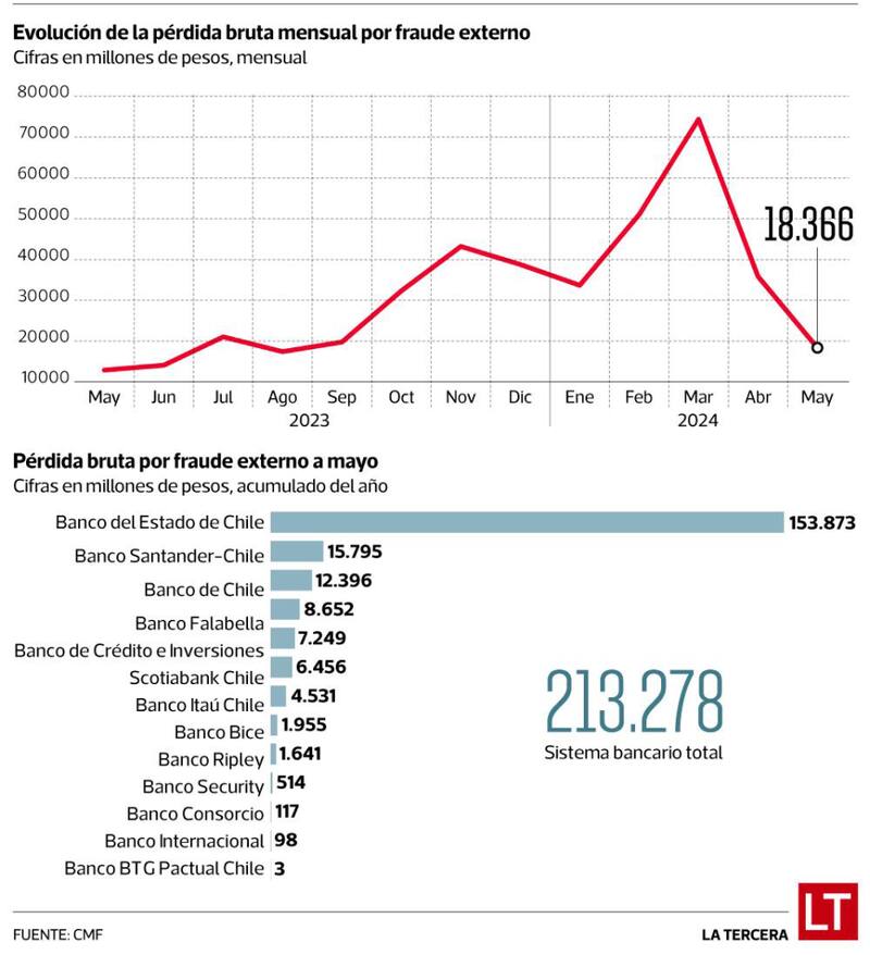 Pese a que no estaba totalmente en régimen en abril y mayo, la aprobación de ese proyecto de ley ya parece haber generado un efecto concreto en el nivel de fraudes que registra la banca. Esto, porque al ver las pérdidas por fraudes externos que reportan los bancos, en el cuarto mes empezaron a disminuir, cuestión que se acrecentó durante el quinto mes del año, según las cifras que consolida la Comisión para el Mercado Financiero (CMF).