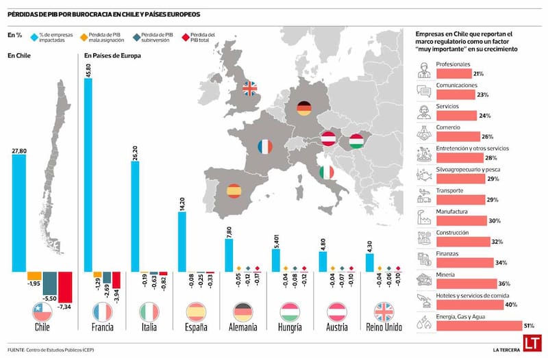 Si bien la investigación intenta comparar los resultados de Chile con otros países de Europa, constata importantes diferencias en la metodología utilizada, cobertura y los periodos estudiados. “Es interesante notar que, aunque la pérdida estimada del PIB en Chile es casi dos veces mayor que en Francia, el porcentaje de empresas restringidas en Chile es poco más de la mitad que en ese país. Esto sugiere que una menor proporción de empresas en Chile experimentan una mayor distorsión debido a la burocracia. No obstante, es importante considerar las diferencias metodológicas entre los datos utilizados”, añade el estudio, el que precisa que la encuesta utilizada en Europa (Efige) se realizó en 2010 y se centra en el sector manufacturero, mientras que el sondeo nacional se hizo en 2022 para todos los sectores de la economía.