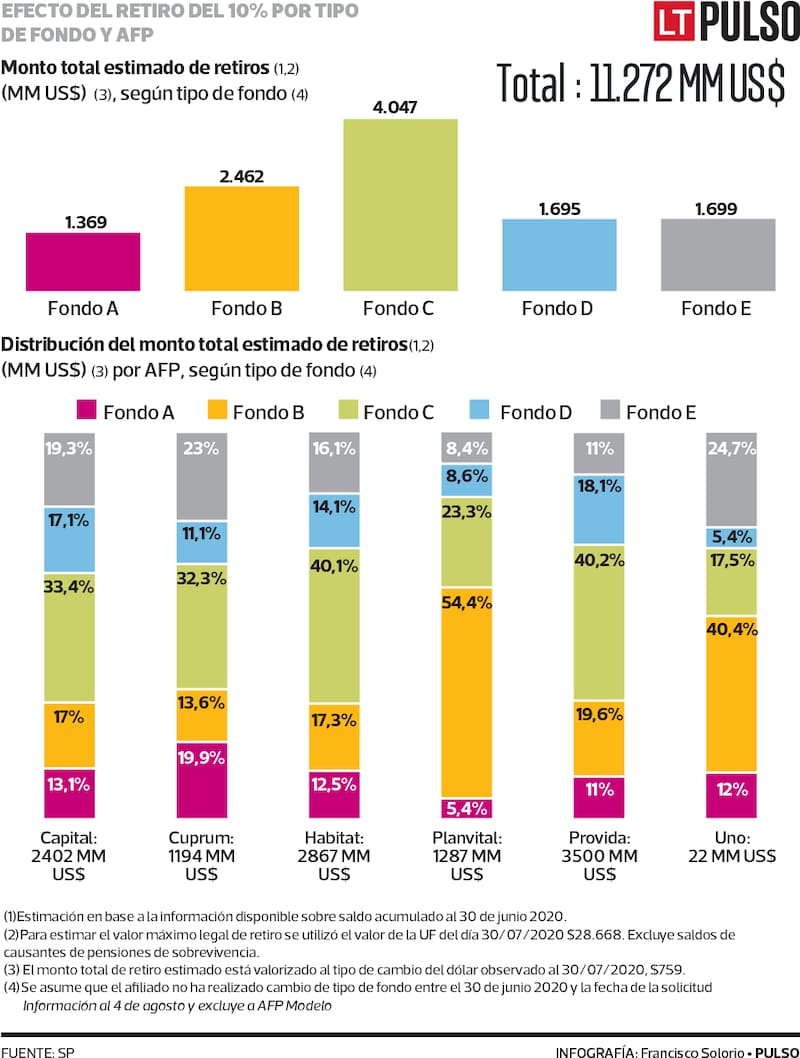 Provida concentra el mayor monto con US$3.500 millones (31% del total que se solicitó retirar al 4 de agosto), le sigue Habitat con US$2.867 millones (25,4%); Capital, con US$2.402 millones (21%); Planvital, con US$1.287 millones (11,4%); Cuprum, con US$1.194 millones (10,6%), y UNO, con US$22 millones (0,2%).