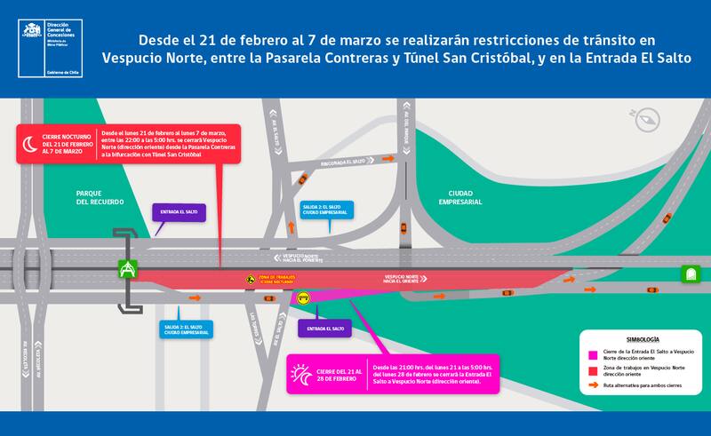 La última intervención tendrá lugar entre el lunes 21 de febrero y el lunes 7 de marzo, en horario nocturno. Entre las 22 horas y las 5 am se cerrará un tramo de Vespucio Norte hacia el oriente, desde la Pasarela Contreras a la bifurcación con Túnel San Cristóbal.