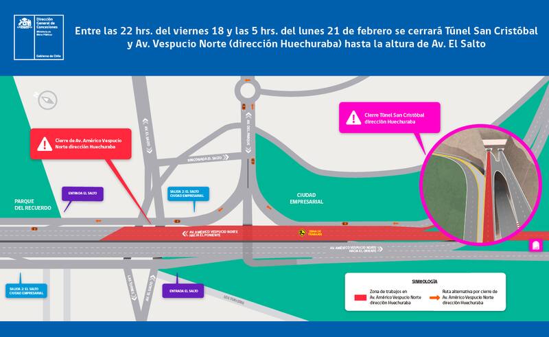 La primera intervención se efectuará desde las 22:00 horas de este viernes hasta las 5:00 horas del lunes 21 de febrero, cuando se cerrará la calzada hacia el poniente (dirección Huechuraba) del Túnel San Cristóbal y de Vespucio Norte, hasta la altura de Av. El Salto, según informó durante esta jornada la Dirección General de Concesiones.