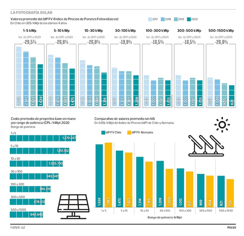 Esto es parte de los resultados de una nueva versión del Índice de Precios Fotovoltaicos 2020 que realiza GIZ (Sociedad Alemana de Cooperación Internacional) y el Ministerio de Energía, el cual abarca diferentes componentes para la instalación de paneles solares. El estudio, que fue realizado a través de una encuesta aplicada a 58 empresas que declararon haber realizado al menos un proyecto de este tipo durante los últimos 12 meses, está en el marco del apoyo a la NAMA (Acción de Mitigación Nacionalmente Apropiada) Energías Renovables para Autoconsumo en Chile, que es uno de los compromisos locales del Acuerdo de París. Está dirigido a proveedores del mercado solar FV “y a potenciales clientes y personas interesadas de la ciudadanía con la intención de darle transparencia al mercado sobre los precios de esta tecnología”, indica el documento.